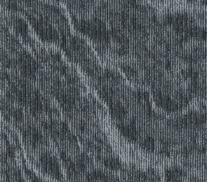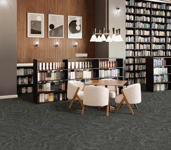 Inked carpet tile features fluid contours and unpredictable movement that give the floor an organic quality. The marbleized design creates a captivating aesthetic inspired by the soft lines and curves reminiscent of old book covers. The wavy layered pattern adds an unpredictable charm for design versatility.
